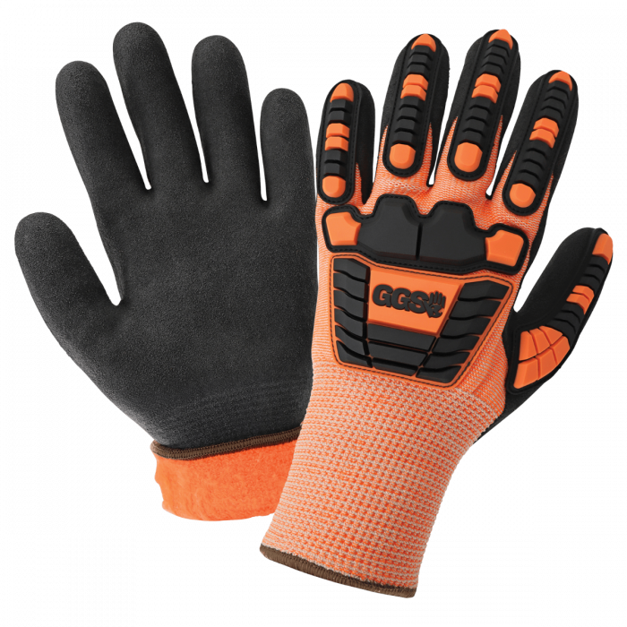 These cut and impact resistant gloves feature an inner liner with a 13-gauge high-visibility orange water-repellent seamless Tuffalene® UHMWPE shell. The inner liner is a 10-gauge brushed acrylic terry cloth. Black foam rubber coats the palm and provides grip, while the TPU impact protection cushions the knuckles and metacarpal bones. The knit wrist cuff provides a secure fit.